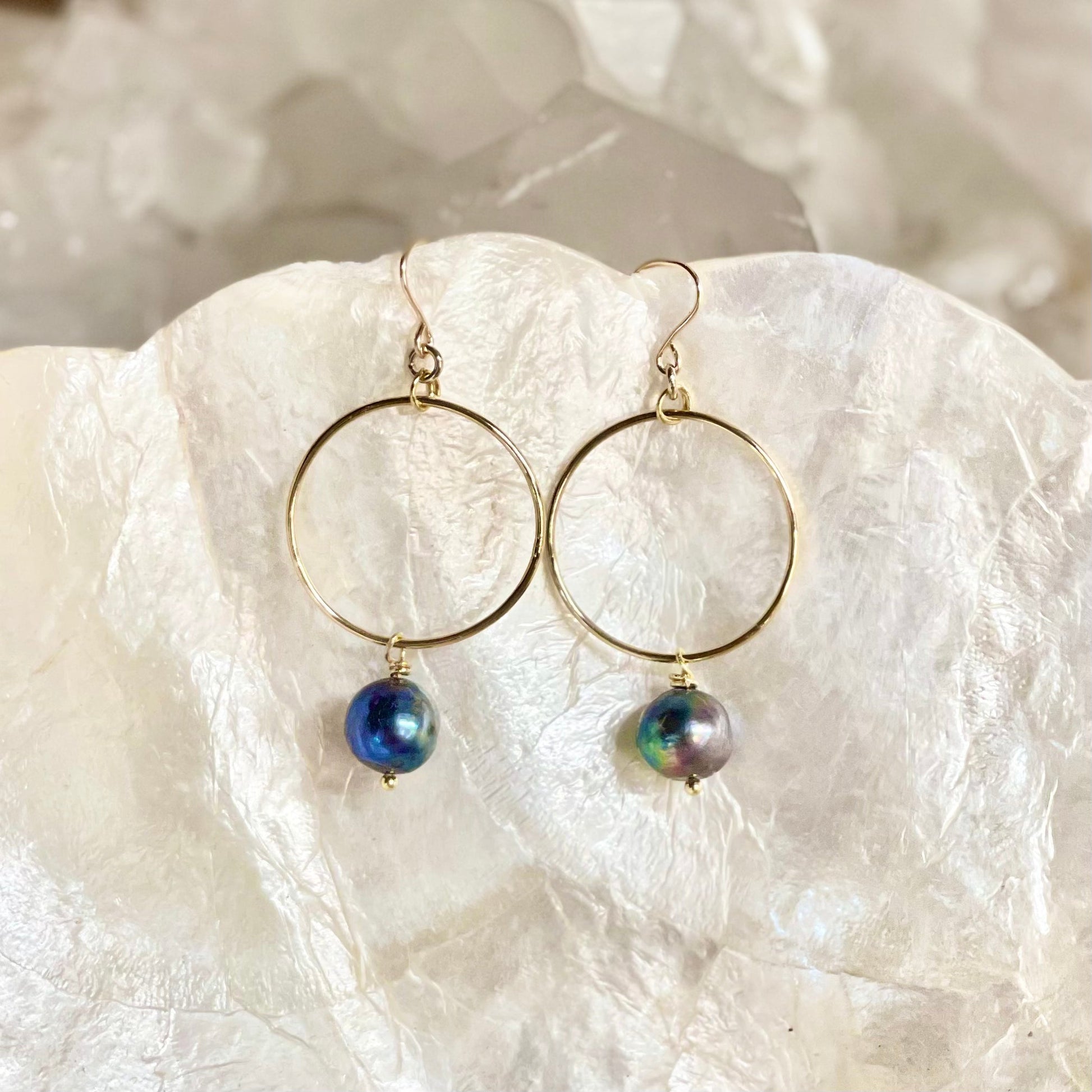 A new take on the classic pearl hoops, these gorgeous earrings are handmade on the North Shore of O'ahu in Hale'iwa, Hawai'i. They feature a single pearl on each earring and are 14K gold fill.