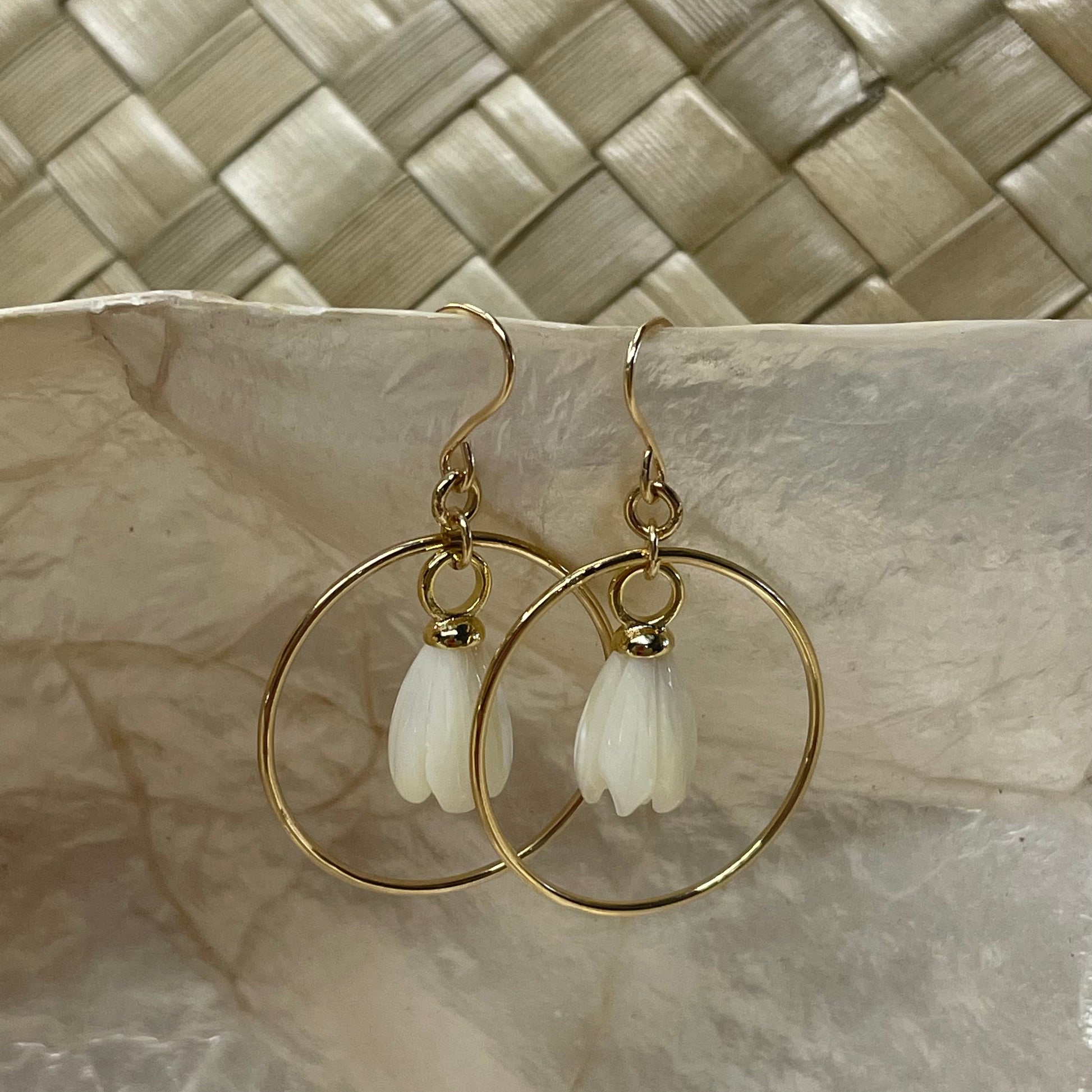 Another take on a classic earring, these 14K gold filled hoops feature gorgeous mother of pearl Pīkake charms within the centers. Simple enough for daily wear and dressy enough for a night out, these hoops are sure to become a staple.